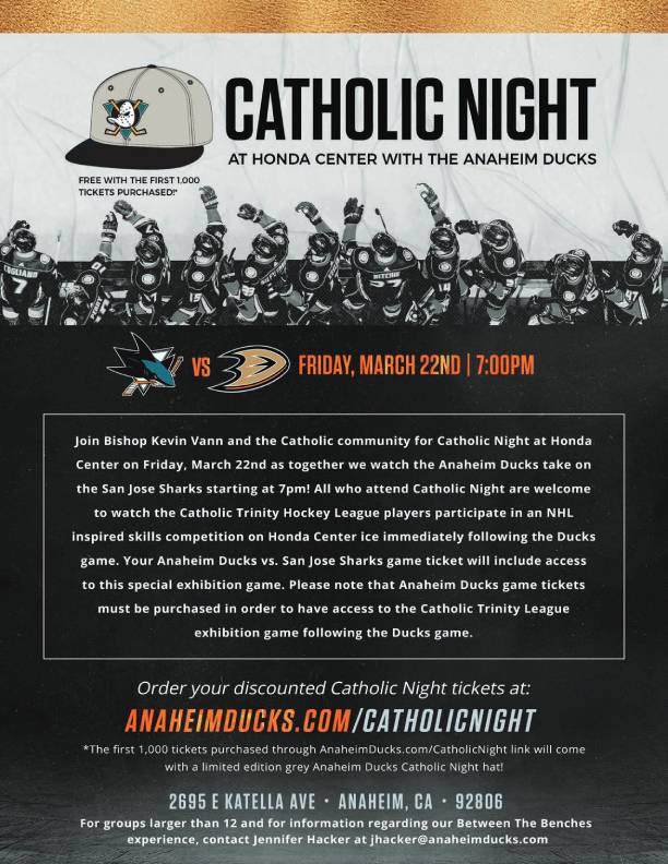 On March 22nd @ 7PM, you can enjoy this Catholic night event at the Honda Center with the Anaheim Ducks! Please see the flyer below for more information!