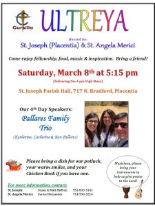 « All Events This event has passed. Bi-Parish Ultreya St Joseph & St Angela Merci March 8 @ 5:15 pm - 7:30 pm « Lenten Retreat School of Leaders » Add to calendar Google Calendar iCalendar Outlook 365 Outlook Live Details Date: March 8 Time: 5:15 pm - 7:30 pm Event Category: Ultreya Venue St. Joseph (Placentia) 717 N. Bradford Ave Placentia, CA 92870 United States + Google Map