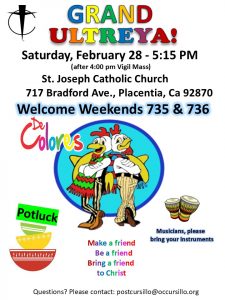 « All Events Grand Ultreya (#735 & #736) February 28 @ 5:15 pm - 9:00 pm « Women’s Cursillo #736 Tri-Parish Ultreya St Angela Merci, St Martin De Porres, St Joseph (Placentia) » Add to calendar Google Calendar iCalendar Outlook 365 Outlook Live Details Date: February 28 Time: 5:15 pm - 9:00 pm Event Categories: Grand, Ultreya Venue St. Joseph (Placentia) 717 N. Bradford Ave Placentia, CA 92870 United States + Google Map