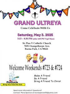 « All Events This event has passed. Grand Ultreya May 3 @ 5:15 pm - 8:30 pm « Palanca Reminder Inspirational Catholic Women » Add to calendar Google Calendar iCalendar Outlook 365 Outlook Live Details Date: May 3 Time: 5:15 pm - 8:30 pm Event Category: Grand Venue St Pius V 7691 Orangethorpe Ave. Buena Park, 90621 United States + Google Map