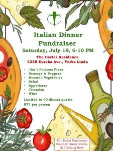 « All Events This event has passed. Italian Dinner Fundraiser July 19 @ 6:00 pm - 10:00 pm « Men’s Cursillo #728 Palanca Reminder » Add to calendar Google Calendar iCalendar Outlook 365 Outlook Live Details Date: July 19 Time: 6:00 pm - 10:00 pm Venue Carter’s Residence 4338 Eureka Ave Yorba Lina, CA 92886 United States + Google Map