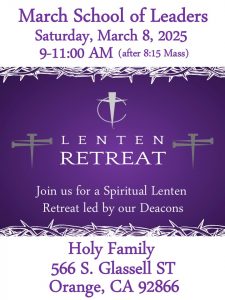 « All Events This event has passed. Lenten Retreat March 8 @ 9:00 am - 11:00 am « St Denis Ultreya Bi-Parish Ultreya St Joseph & St Angela Merci » Add to calendar Google Calendar iCalendar Outlook 365 Outlook Live Details Date: March 8 Time: 9:00 am - 11:00 am Event Category: School of Leaders Venue Holy Family 566 South Glassell St. Orange, CA 92866 United States + Google Map