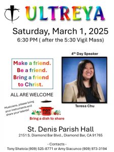 « All Events This event has passed. St Denis Ultreya March 1 @ 6:30 pm - 8:30 pm « Grand Ultreya Lenten Retreat » Add to calendar Google Calendar iCalendar Outlook 365 Outlook Live Details Date: March 1 Time: 6:30 pm - 8:30 pm Event Category: Ultreya Venue St. Denis 2151 S. Diamond Bar Blvd. Diamond Bar, CA 91765 United States + Google Map