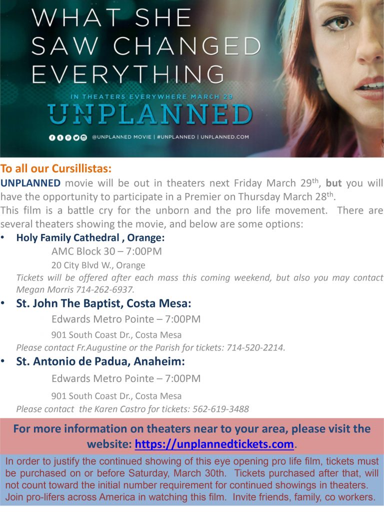 Our English Post-Cursillo Secretariat, Tilin Chen has put together an awesome list of extra Premiere showings of the movie Unplanned! Please see the flyer below: